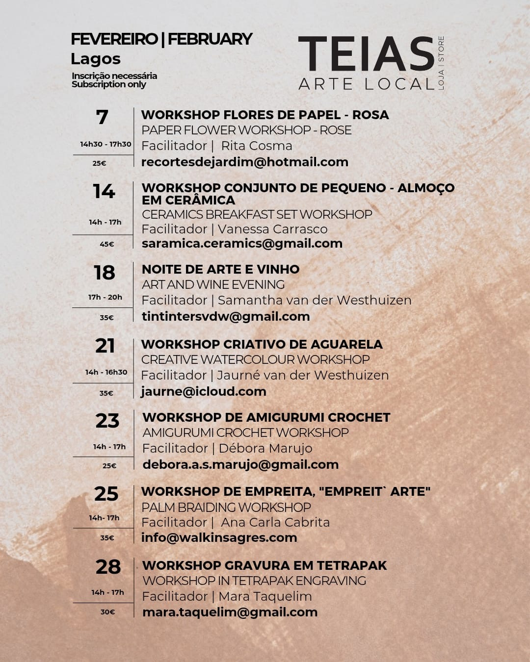If you have an interesting workshop to propose to us, send us an email to info@teialagos.pt