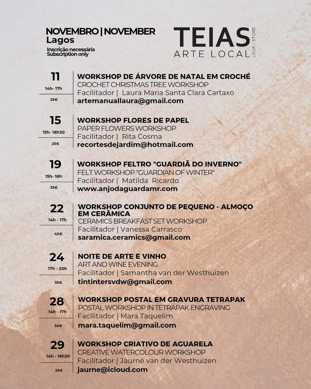 If you have an interesting workshop to propose to us, send us an email to info@teialagos.pt
