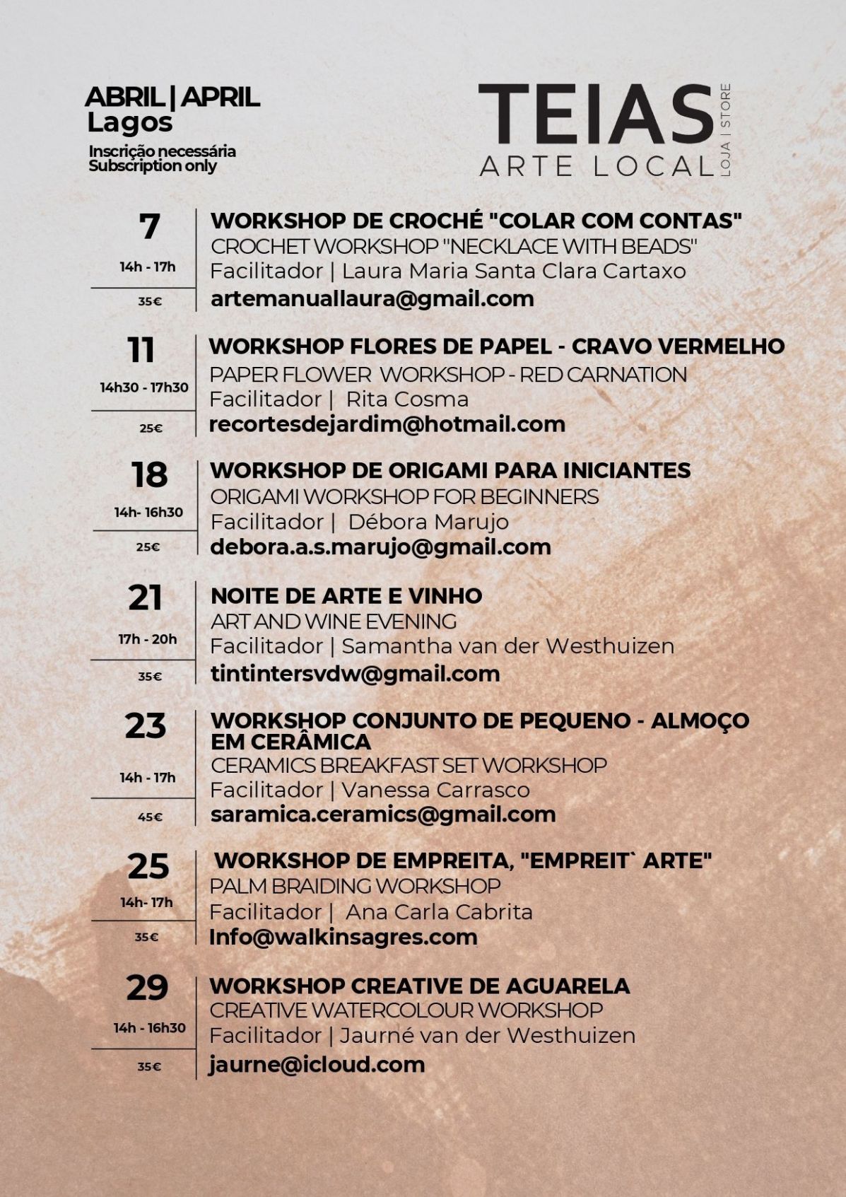 If you have an interesting workshop to propose to us, send us an email to info@teialagos.pt